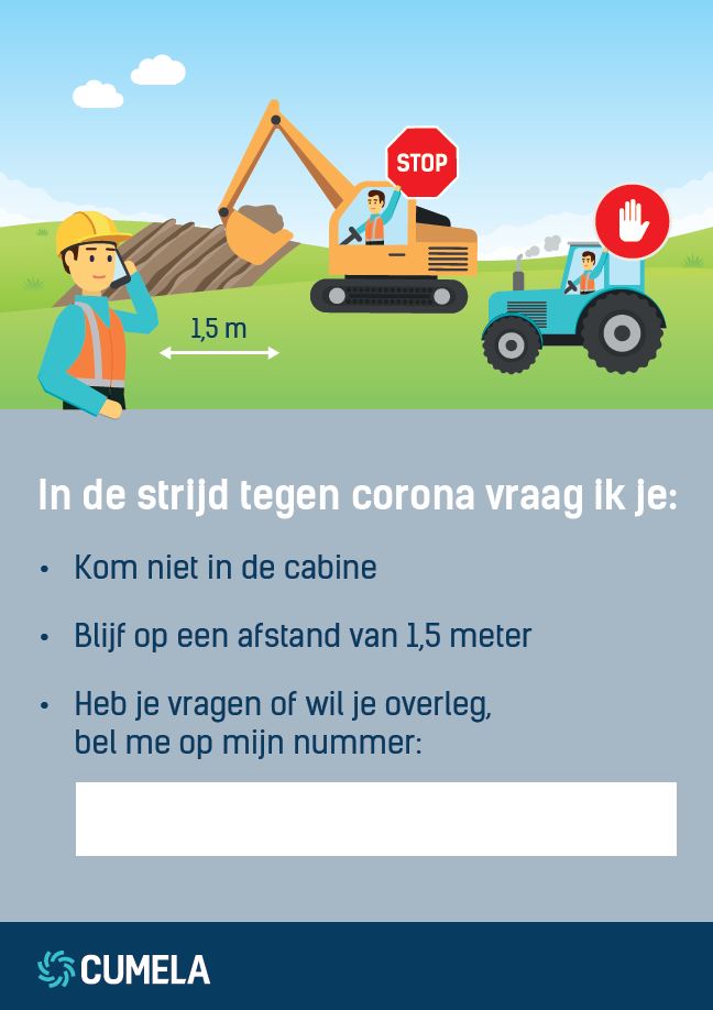 In de strijd tegen het coronavirus houden we 1,5 meter afstand van elkaar. Om te voorkomen dat mensen in de omgeving de deur van je cabine opentrekken is er de ‘Bel me’-poster. Download hem van de cumela-website en plak hem op je cabinedeur!